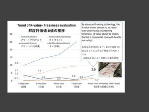 The association (Mie Fisheries Association) has established a consistent freshness management system from catch to shipment. Fish from various regions in western Japan are transported to the sea pen in Miura using live fish boats and live fish trucks, and are kept alive until just before shipment. After landing, they are quickly processed and vacuum-packed in a low-temperature facility compliant with HACCP, and delivered to Singapore via the shortest route after quality inspection. The K value is used as an indicator of freshness, which indicates the rate at which ATP (a precursor to umami components) inside the fish body decomposes over time. Generally, a K value exceeding 20 is considered a state that requires cooking. In our association, by utilizing advanced freezing technology, it has been confirmed that the increase in K value after 7 days is extremely low compared to chilled products, allowing for the maintenance of freshness. It has been demonstrated that consistent temperature management through freezing maintains higher freshness throughout the entire logistics period compared to fresh fish transported by air. In this way, by combining immediate processing and high-precision freezing technology, our products can be enjoyed in Singapore in a state that is not inferior to fresh fish imported by air, but rather in a fresher condition.